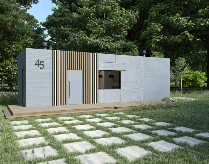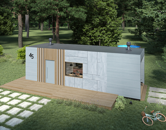 Вдохновленные скандинавским дизайном, ребята выполнили наружную отделку дома Jung из тонированной фанеры и деревянной вагонки, выкрашенной в спокойный серый цвет. Уложенные вокруг оконного проема плиты из влагостойкой фанеры создают особый акцент на этой зоне капсульного дома.